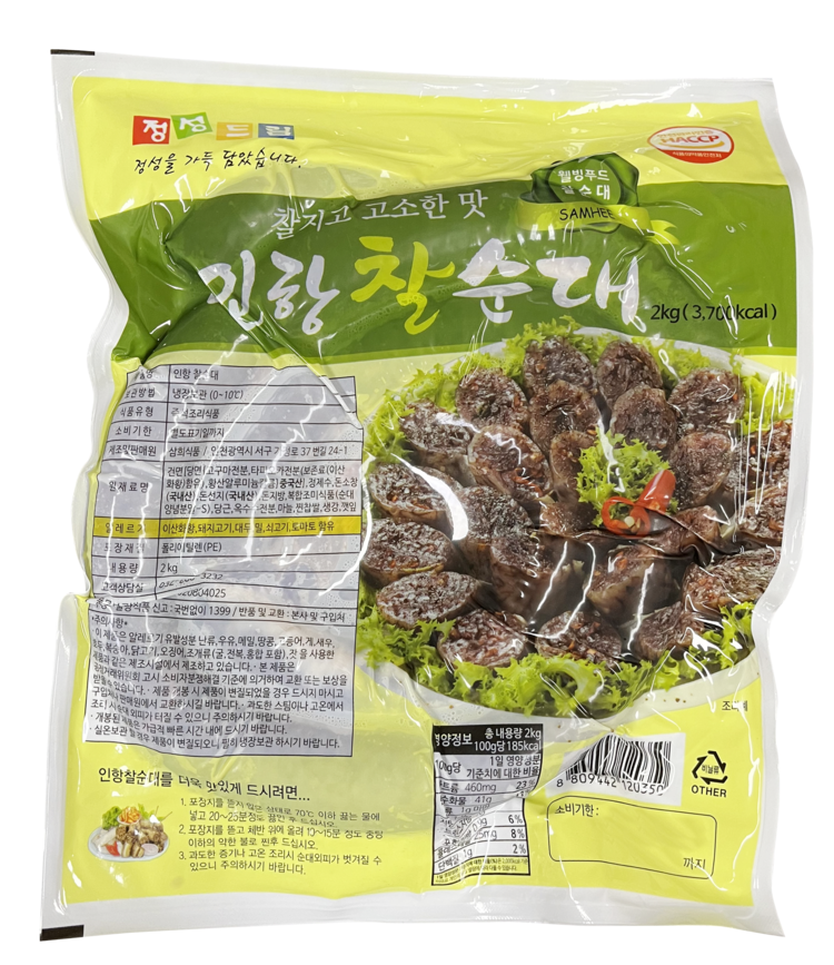 건면[당면{고구마전분,타피오카전분(보존료(이산화황)함유),황산알루미늄칼륨}중국산],정제수,돈소창(국내산),돈선지(국내산),돈지방,복합조미식품(순대양념분말 S-2),당근,마늘,찐찹쌀,생강,깻잎
